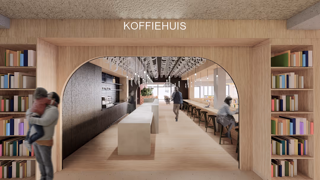 At the heart of both buildings lies a central café – the social anchor of each location. Around it, a large wooden gesture unfolds, forming a sculptural element that combines seating, circulation, and architectural rhythm. From this centre, the library and educational facilities expand organically, offering spaces to study, take courses, read, meet, or perform.