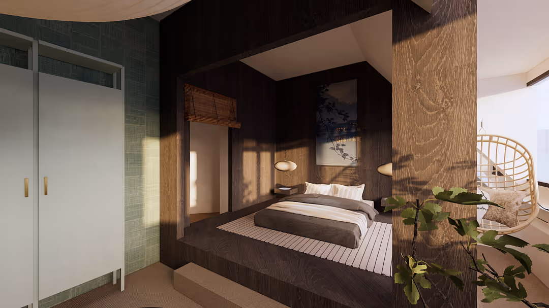 The core of TMRRW is built around the philosophy of the washitsu: one room, many functions, depending on the time and need. This idea was applied throughout the location. The lobby is not just a reception area – it serves as a café, yoga studio, film room, and communal living room. The shortstay apartments are modular in design: sliding doors, alcove structures, 1:2 spatial ratios, and tatami-inspired layouts create a calm, adaptive environment. Here, space is not a limitation – it’s an opportunity.